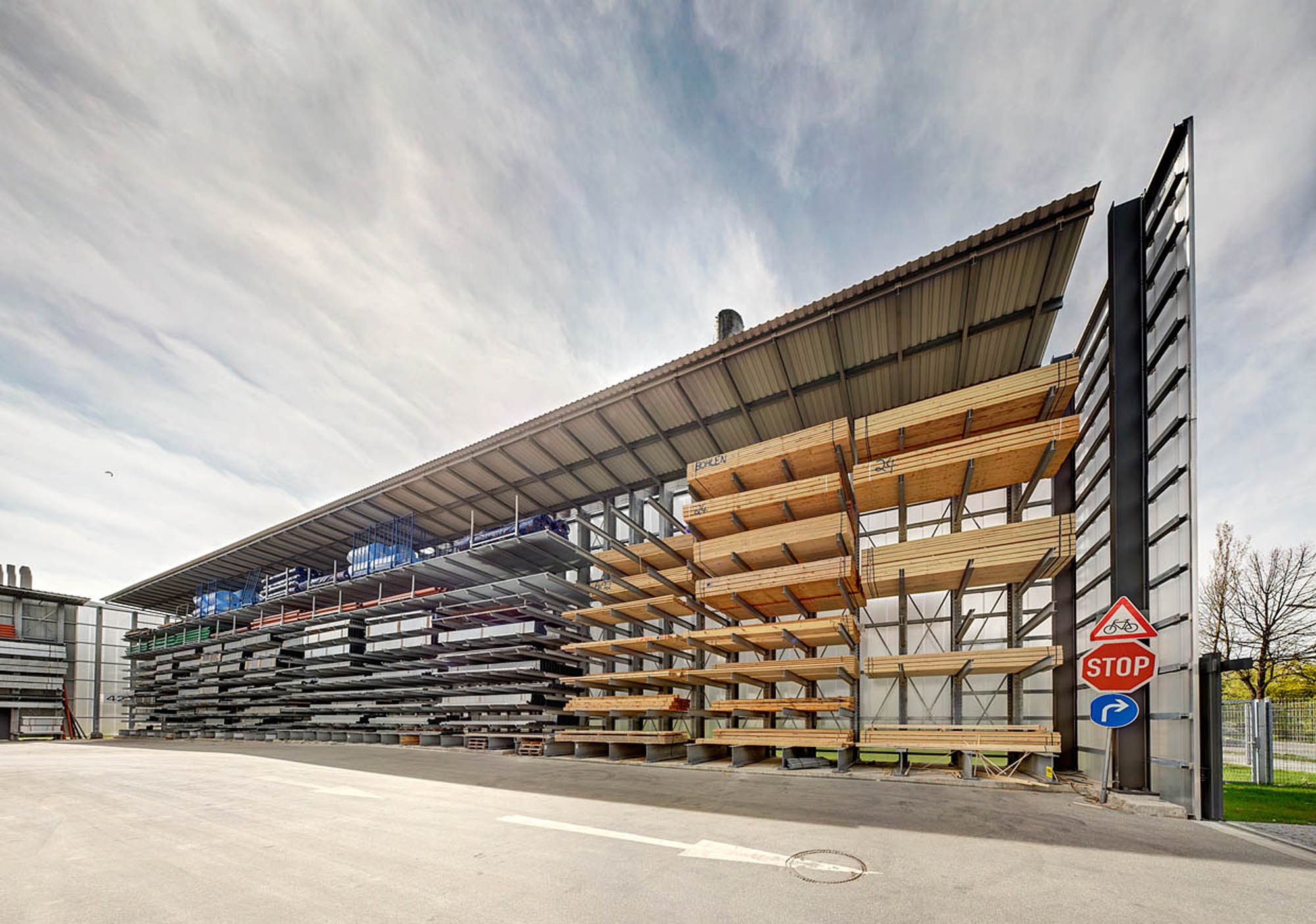 So for example, cantilever racks were delivered in dip galvanized for outdoor use. Here, one can find all the products available, such as KG-pipes, concrete slabs or wooden planks on their places in the shelves. The scaffolds are partially covered and are equipped with grating as goods carriers. A particular challenge here was the sideways falling slanted roof, which was necessary because of land leveling.