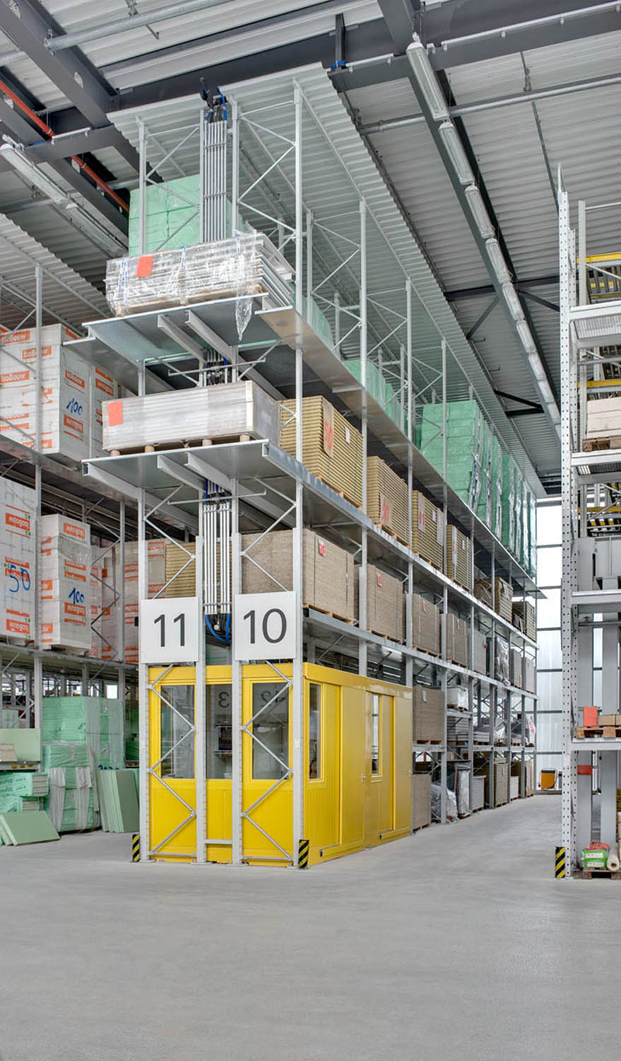 Construction materials are stored by OHRA on pallets in both the indoor and outdoor areas in rugged pallet racks. In the individual shelf compartments with a clear width of 2,900 mm and pallets with supernatant can be easily stored.At the front of the pallet racks the proper and efficient commissioning transfer stations were attached. Furthermore, it could be integrated for the high capacity of individual containers within the framework of the pallet racking.